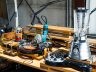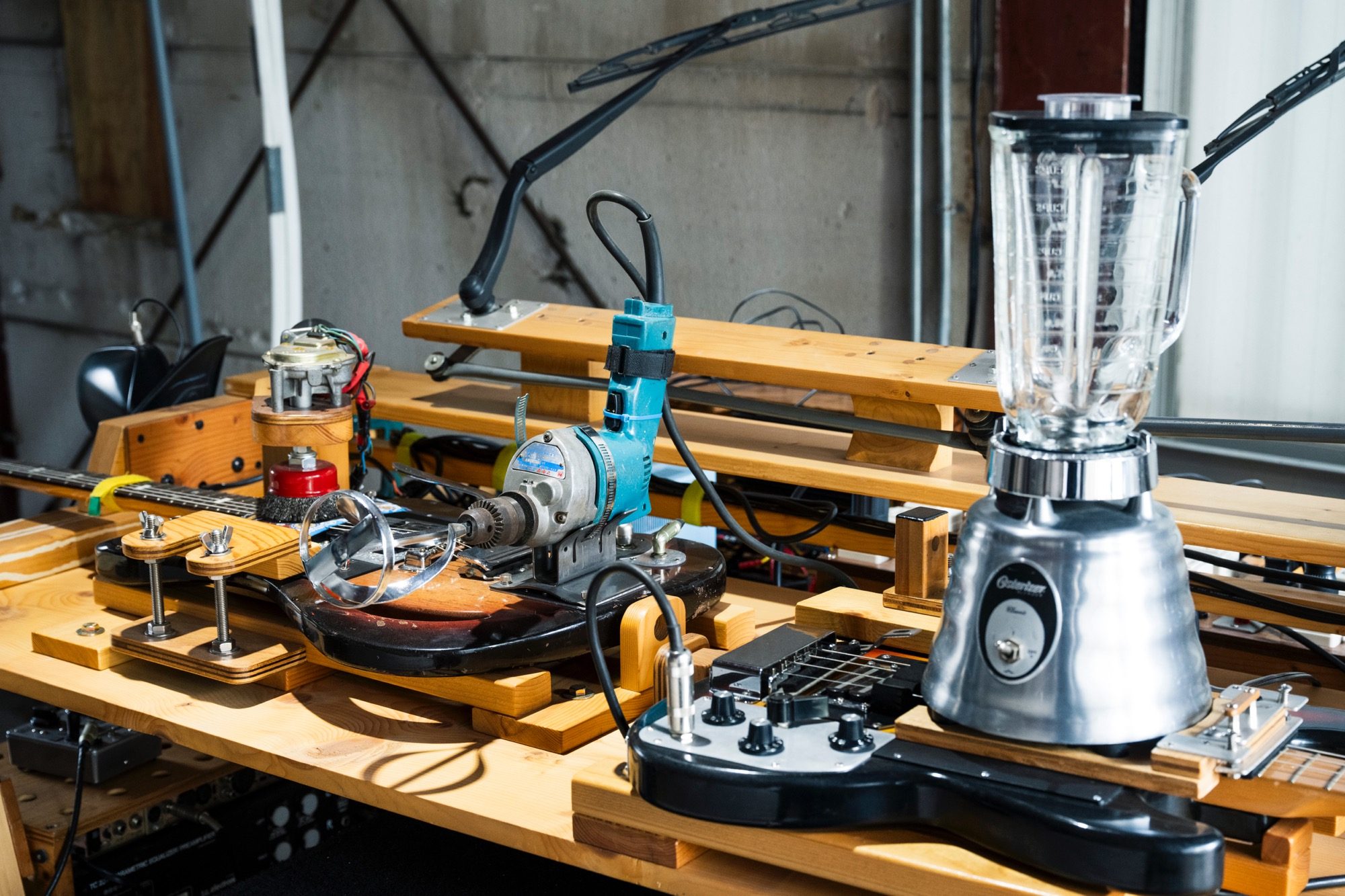 Combining sound sculptures made of industrial products of the 20th century such as mass-produced household appliances, electric guitars, automobiles, construction materials and toys with DIY technology, Ujino’s artistic language expands to videos or large-scale installations.