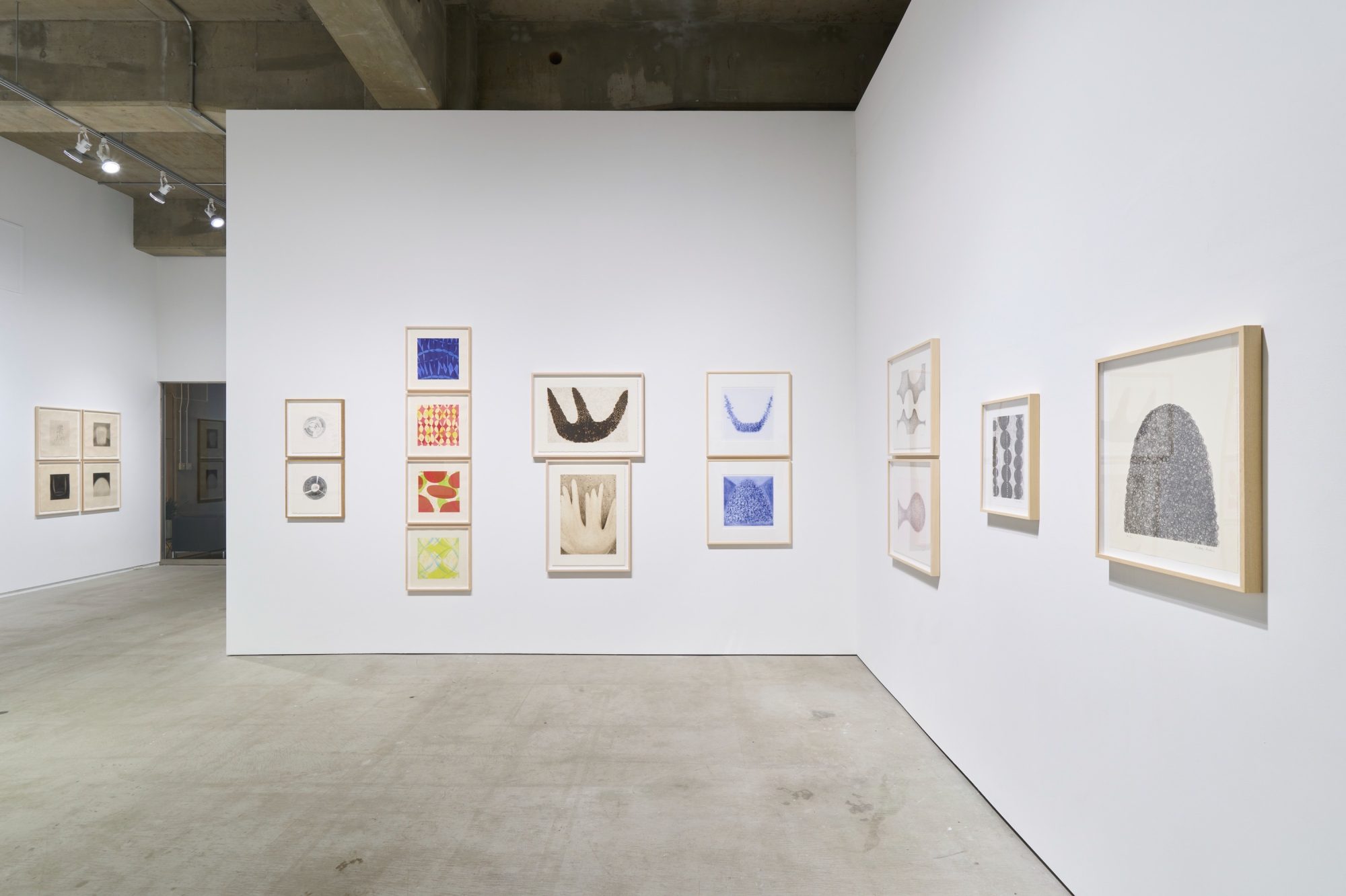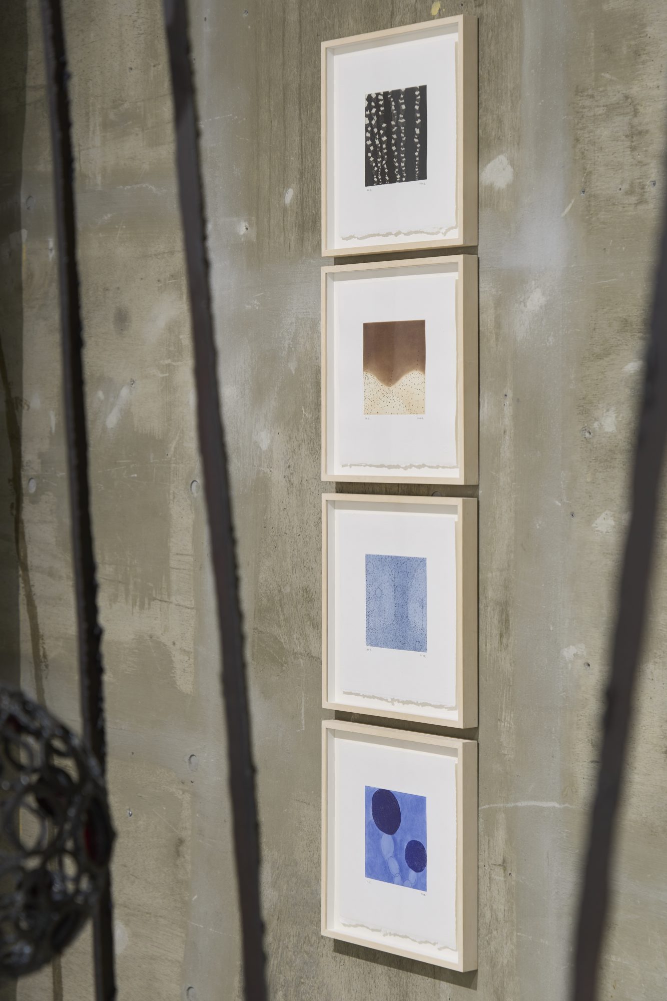 青木の彫刻作品の多くはそのスケールの大きさと展示されるスペースとの関係性ゆえに会期終了後にはパーツへと解体され、写真等による記録と作者と鑑賞者の記憶の中のみに残る存在となります。それに対し青木の版画作品には作家の手の跡が様々な版と技法により紙の上に落とし込まれ、その詩的なタイトルとともに留まっています。その多様な線とかたちは平面の奥に広がる鉄の彫刻の内部へと入り込む繊細な世界、青木の思考の断片を思わせ、作家の彫刻作品に求める「目に見えないが確かに存在する何か」が可視化されているともいえるのではないでしょうか。